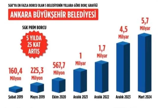 CHP yönetimindeki Ankara'da Büyükşehir Belediyesi'nde ise 5 yılda borçlar 25 kat artış gösterdi.