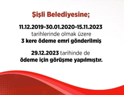 Şişli Belediyesine, 11.12.2019-30.01.2020-15.11.2023 tarihlerinde olmak üzere 3 kere ödeme emri gönderildiği, 29.12.2023 tarihinde de ödeme için görüşme yapıldığı ifade edildi.
