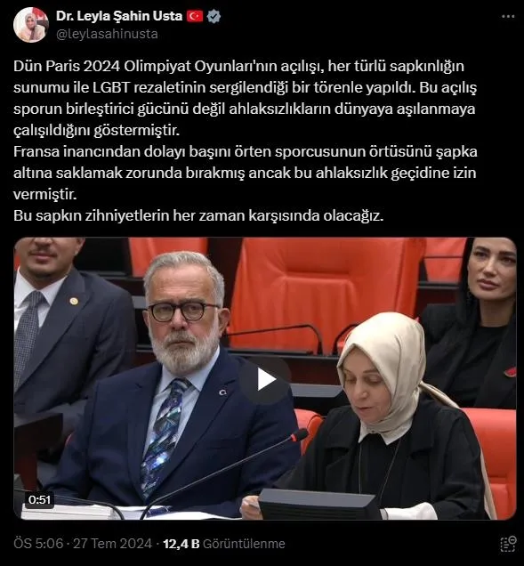 "Fransa yabancı ülke vatandaşı olan sporculara bu izni verirken kendi eşitlikle ilişkili anlayışı çerçevesinde kendi atletine bu izni vermedi; gerçekten de bu kınanması gereken bir şey ama yine yanı başımızda Jina Mahsa Amini örneğinde ve ondan sonra, saçının teli göründüğü için katledilen bunca kadın varken, katil bir erkek aklı kadınları saçları görünüyor diye sürekli ölüme mahkûm ederken başörtüsü zulmünün bu yönüyle hiçbir mücadele etmeksizin bu konuları bu şekilde gündemleştirdiğinizde ne kadar adil oluyorsunuz, bütün bunları da gerçekten düşünmek gerekiyor. LGBTİ toplumuna gelince… Onlar kimsenin çocuklarını taciz etmiyor, kimseye zarar vermiyor…''