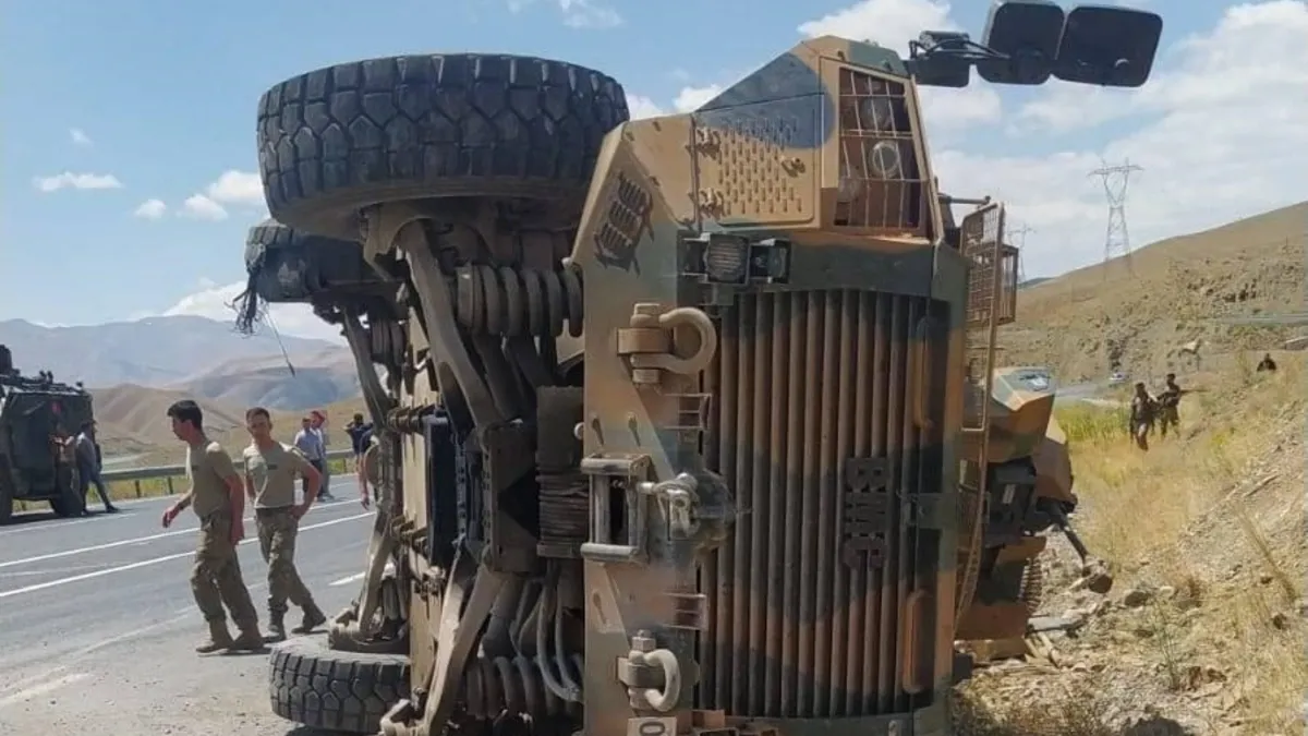 Van'dan Hakkari yönüne göreve giden askeri konvoyda bulunan zırhla araç, lastiğinin patlaması sonucu kontrolden çıkıp yan yattı.