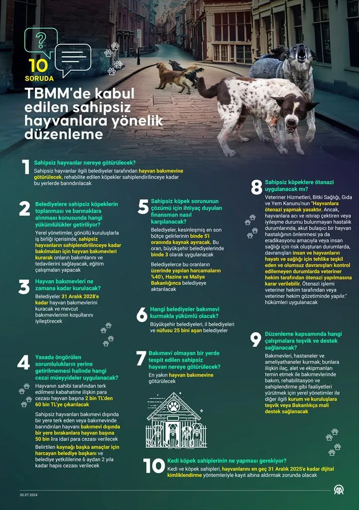 Kanunla "yakala-kısırlaştır-sal" metodu terk ediliyor, sahipsiz hayvanların bakımevlerinde barındırılması ve rehabilite edilmesi öngörülüyor.