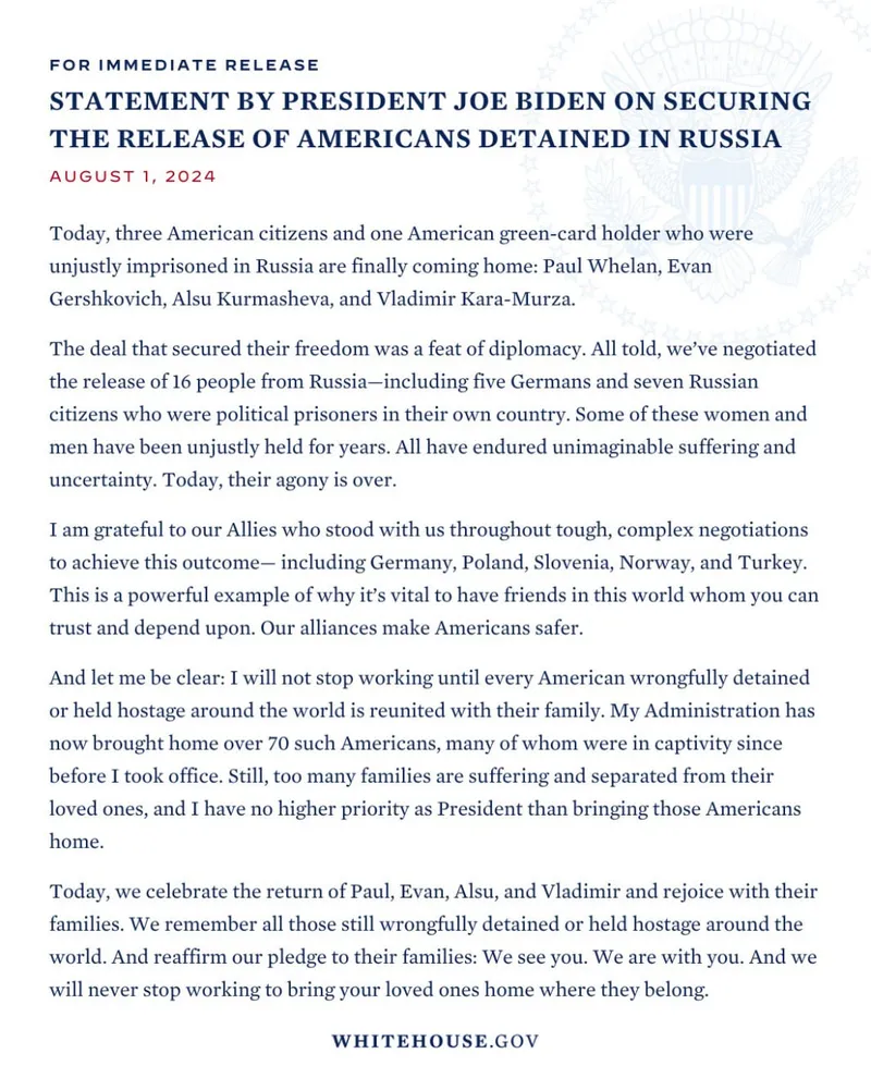 Paul Whelan, Evan Gershkovich, Alsu Kurmasheva ve Vladimir Kara-Murza'nın serbest kalacak olmasından dolayı emeği geçen ülkelere ayrıca teşekkür eden Biden, "Bu zor ve kompleks müzakereler boyunca bu sonuca ulaşmak için Türkiye, Almanya, Polonya, Slovenya ve Norveç gibi müttefiklerimize müteşekkirim." ifadesini kullandı.