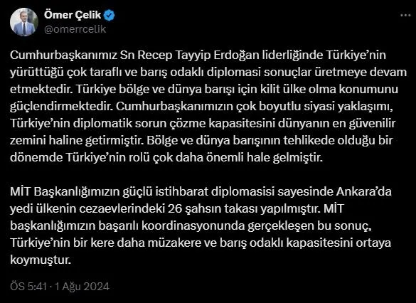 "Cumhurbaşkanımızın çok boyutlu siyasi yaklaşımı, Türkiye'nin diplomatik sorun çözme kapasitesini dünyanın en güvenilir zemini haline getirmiştir. Bölge ve dünya barışının tehlikede olduğu bir dönemde Türkiye'nin rolü çok daha önemli hale gelmiştir. MİT Başkanlığımızın güçlü istihbarat diplomasisi sayesinde Ankara'da 7 ülkenin cezaevlerindeki 26 şahsın takası yapılmıştır. MİT başkanlığımızın başarılı koordinasyonunda gerçekleşen bu sonuç, Türkiye'nin bir kere daha müzakere ve barış odaklı kapasitesini ortaya koymuştur.