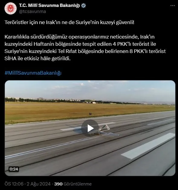 "Kararlılıkla sürdürdüğümüz operasyonlarımız neticesinde, Irak'ın kuzeyindeki Haftanin bölgesinde tespit edilen 4 PKK'lı terörist ile Suriye'nin kuzeyindeki Tel Rıfat bölgesinde belirlenen 8 PKK'lı terörist SİHA ile etkisiz hale getirildi."