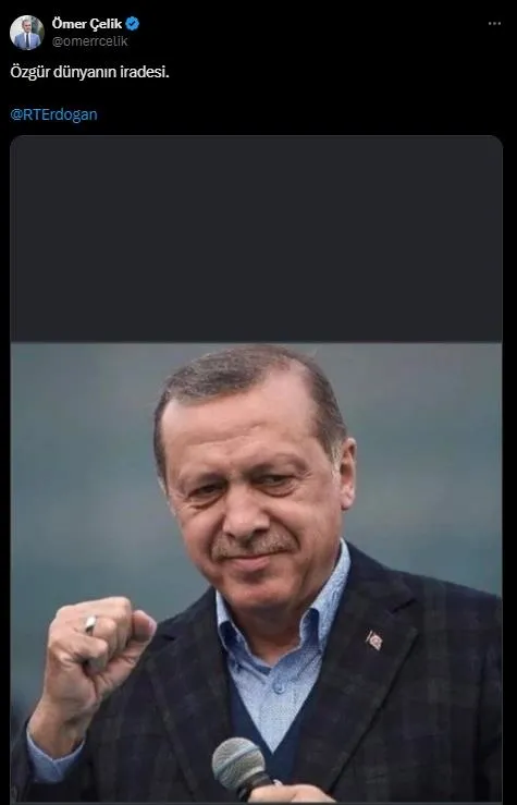 AK Parti sözcüsü Ömer Çelik, "Özgür dünyanın iradesi. Recep Tayyip Erdoğan" dedi.