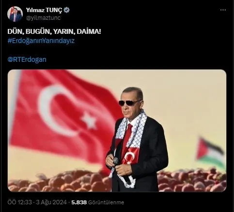 "Kıymetli Cumhurbaşkanımız Recep Tayyip Erdoğan'ın millet sevdasını ve ülkemizin kalkınmasına yaptığı muazzam katkıları karalama girişimlerine geçit vermeyeceğiz. Milletimizin lideri ve tüm mazlumların umut ışığı olan Cumhurbaşkanımızın yanındayız. Onun önderliğinde güçlü ve müreffeh bir Türkiye için hep birlikte çalışmaya devam edeceğiz."