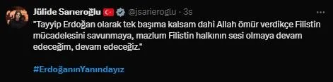 Kimsesizlerin kimsesi, mazlumların sesi olmuştur; olmaya da devam edecektir. #ErdoğanınYanındayız " ifadelerini kullandı.