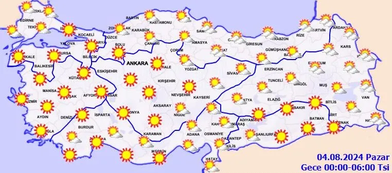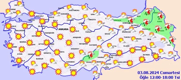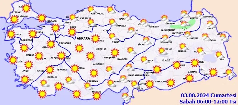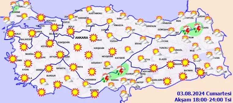 Meteoroloji Genel Müdürlüğü olarak yapılan değerlendirmelere göre, ülkemizin kuzey kesimleri ve Doğu Akdeniz'in parçalı bulutlu, Doğu Karadeniz kıyı illerinin iç kesimleri, Doğu Anadolu'nun kuzeydoğusu ve Doğu Akdeniz'in Toroslar kesimi ile Artvin çevreleri ve Edirne'nin kuzey kesimlerinin yer yer çok bulutlu yerel sağanak ve gök gürültülü sağanak yağışlı, diğer yerlerin az bulutlu ve açık geçeceği tahmin ediliyor.