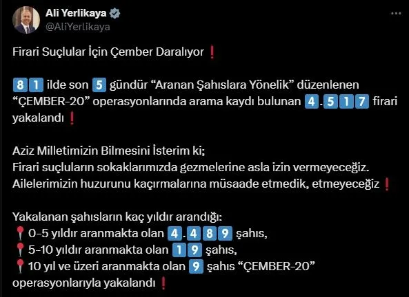 İçişleri Bakanı Ali Yerlikaya, yurt genelinde son 5 günde aranan kişilere yönelik düzenlenen "Çember-20" operasyonlarında, çeşitli suçlardan aranan 4 bin 517 firarinin yakalandığını bildirdi.