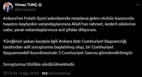 Adalet Bakanı Yılmaz Tunç, Polatlı yakınlarında meydana gelen otobüs kazasında ilişkin soruşturma başlatıldığını, soruşturmada bir Cumhuriyet başsavcıvekili koordinesinde üç Cumhuriyet savcısının görevlendirildiğini bildirdi.