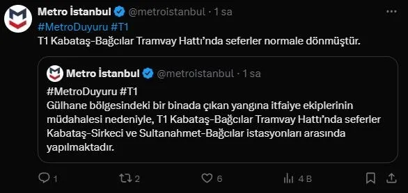 Metro İstanbul'un sosyal medya hesabından yapılan duyuruda, "Gülhane bölgesindeki bir binada çıkan yangına itfaiye ekiplerinin müdahalesi nedeniyle T1 Kabataş-Bağcılar Tramvay Hattı'nda seferler Kabataş-Sirkeci ve Sultanahmet-Bağcılar istasyonları arasında yapılmaktadır." ifadesine yer verildi.