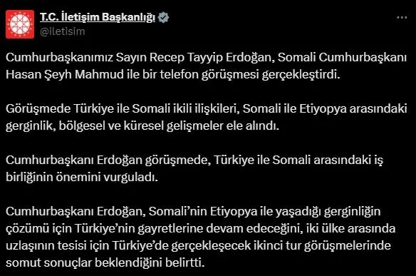 "Cumhurbaşkanımız Sayın Recep Tayyip Erdoğan, Somali Cumhurbaşkanı Hasan Şeyh Mahmud ile bir telefon görüşmesi gerçekleştirdi. Görüşmede Türkiye ile Somali ikili ilişkileri, Somali ile Etiyopya arasındaki gerginlik, bölgesel ve küresel gelişmeler ele alındı. Cumhurbaşkanı Erdoğan görüşmede, Türkiye ile Somali arasındaki iş birliğinin önemini vurguladı. Cumhurbaşkanı Erdoğan, Somali'nin Etiyopya ile yaşadığı gerginliğin çözümü için Türkiye'nin gayretlerine devam edeceğini, iki ülke arasında uzlaşının tesisi için Türkiye'de gerçekleşecek ikinci tur görüşmelerinde somut sonuçlar beklendiğini belirtti"