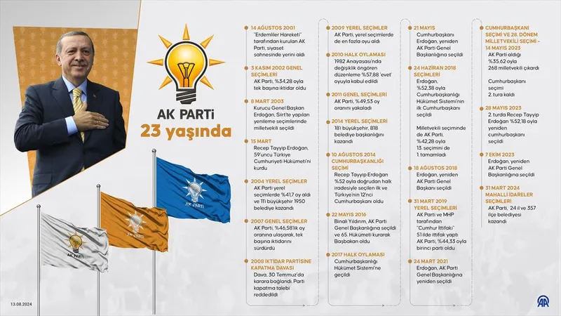 Cumhurbaşkanı Recep Tayyip Erdoğan'ın liderliğinde, 14 Ağustos 2001'de Türkiye'nin 39. partisi olarak kurulan AK Parti, Türkiye siyasetinde 23 yılı geride bıraktı.