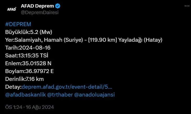 AFAD, Suriye'nin Hama şehrinde 3 dakika arayla 5,2 ve 4,2 büyüklüğünde deprem meydana geldiğini açıkladı. Sarsıntı, Hatay ve Gaziantep'te de hissedildi.
