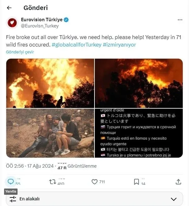 "#globalcallforTurkey" etiketi altında Türkiye'yi aciz göstermeyi hedefleyen çeşitli paylaşımlar yapıldı. Geçmiş tarihli, başka ülkelerde ve noktalarda çıkan yangınlar, İzmir yangınıymış gibi servis edildi.