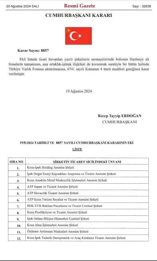 Başkan Recep Tayyip Erdoğan'ın imzasını taşıyan 20 Ağustos 2024 tarihli Resmi Gazete yayımlandı. Buna göre aralarında Koza Altın İşletmeleri Anonim Şirketi'nin de bulunduğu 12 şirketin Hazine'ye ait olan hisselerinin tamamının Türkiye Varlık Fonu'na aktarılacak.