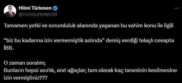 Türkmen, Ekrem İmamoğlu yönetimindeki İBB'ye "Tamamen yetki ve sorumluluk alanında yaşanan bu vahim konu ile ilgili "biz bu kadarına izin vermemiştik aslında" demiş verdiği telaşlı cevapta İBB. O zaman soralım; Bunların hepsi asırlık, anıt ağaçlar; tam olarak kaç tanesinin kesilmesine izin vermiştiniz???" diye sordu.