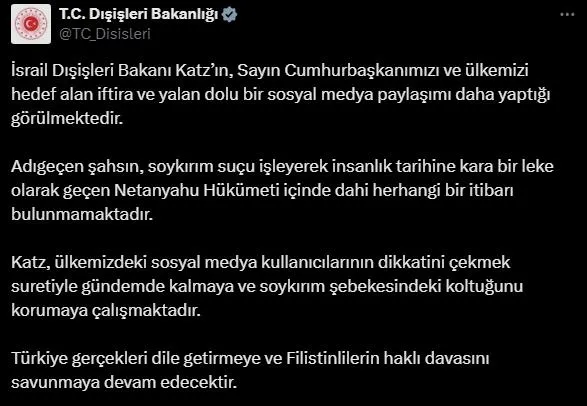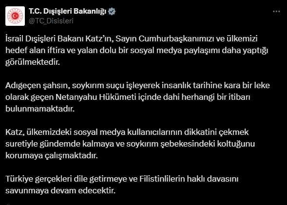 Bakanlık, X sosyal medya hesabından, İsrail Dışişleri Bakanı Katz'ın, Başkan Recep Tayyip Erdoğan'ı ve Türkiye'yi hedef alan sosyal medya paylaşımına ilişkin açıklamada bulundu.