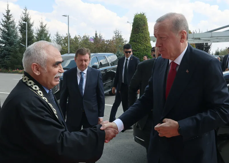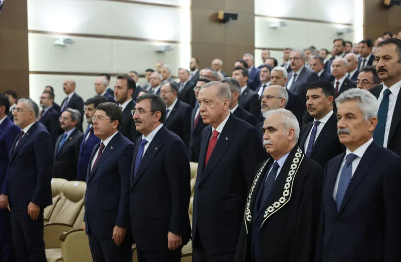 Anayasa Mahkemesi (AYM) Yüce Divan Salonu'nda gerçekleştirilen törene gelişinde Anayasa Mahkemesi Başkanı Kadir Özkaya tarafından karşılanan Erdoğan, daha sonra törenin düzenlendiği salona geçti.