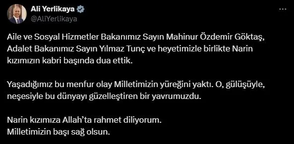 Kabir ziyaretinin ardından İçişleri Bakanı Ali Yerlikaya sosyal medya hesabından, "Aile ve Sosyal Hizmetler Bakanımız Sayın Mahinur Özdemir Göktaş, Adalet Bakanımız Sayın Yılmaz Tunç ve heyetimizle birlikte Narin kızımızın kabri başında dua ettik. Yaşadığımız bu menfur olay Milletimizin yüreğini yaktı. O, gülüşüyle, neşesiyle bu dünyayı güzelleştiren bir yavrumuzdu. Narin kızımıza Allah'ta rahmet diliyorum. Milletimizin başı sağ olsun." dedi.