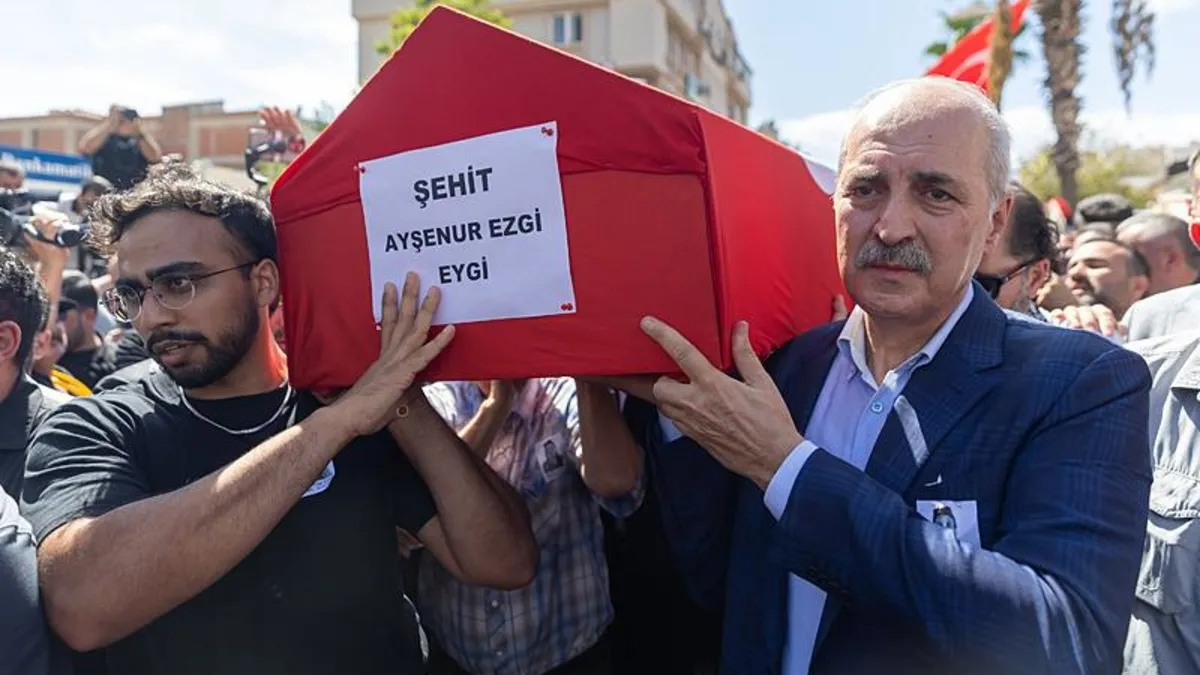 Filistinlilere destek verirken İsrail askerleri tarafından başından vurularak katledilen Ayşenur Ezgi Eygi'nin cenaze töreni için Aydın'ın Didim ilçesine gelen TBMM Başkanı Numan Kurtulmuş, Aile ve Sosyal Hizmetler Bakanı Mahinur Özdemir Göktaş ve Adalet Bakanı Yılmaz Tunç ile birlikte taziye evindeki çadırda basın mensuplarına açıklamalarda bulundu.