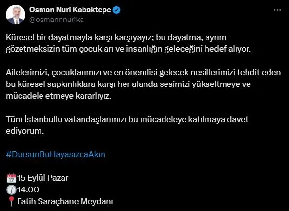 "Küresel bir dayatmayla karşı karşıyayız. Bu dayatma, ayrım gözetmeksizin tüm çocukları ve insanlığın geleceğini hedef alıyor. Ailelerimizi, çocuklarımızı ve en önemlisi gelecek nesillerimizi tehdit eden bu küresel sapkınlıklara karşı her alanda sesimizi yükseltmeye ve mücadele etmeye kararlıyız. Tüm İstanbullu vatandaşlarımızı bu mücadeleye katılmaya davet ediyorum."