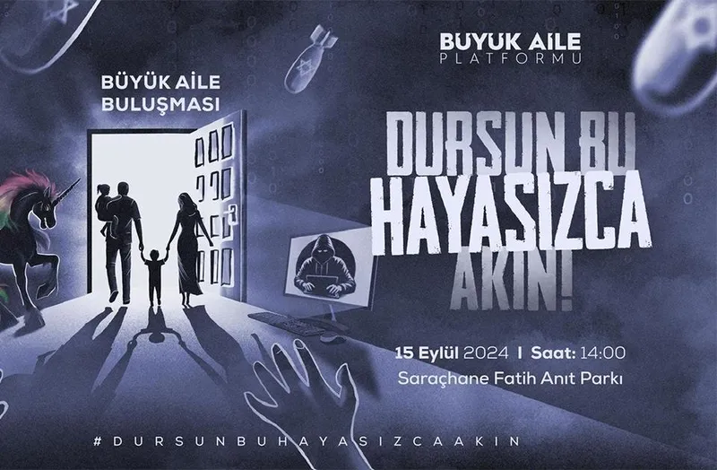 Büyük Aile Platformu Genel Sekreteri Serdar Eryılmaz, 15 Eylül'de "Dursun Bu Hayasızca Akın" sloganıyla "Büyük Aile Buluşması ve Sessiz Yürüyüş" düzenleyeceklerini belirtti.
