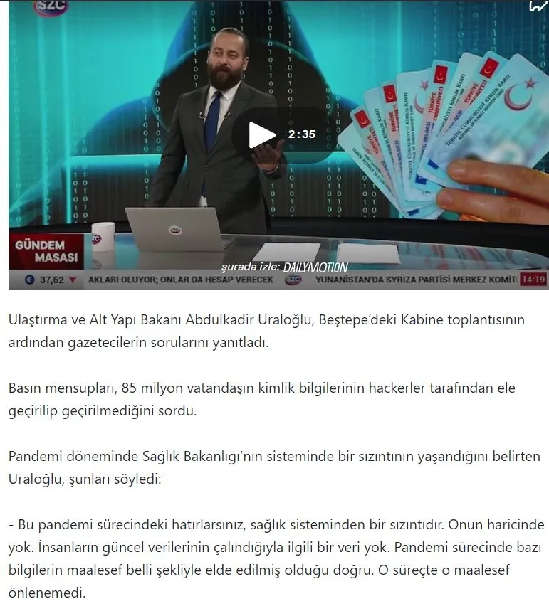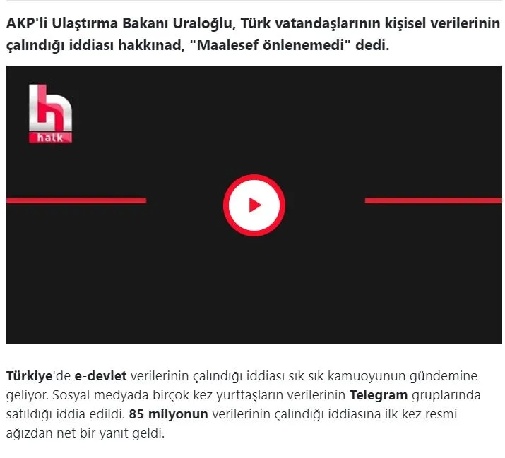 85 milyon kişinin kimlik bilgilerinin çalındığı iddialarına yanıt veren Ulaştırma ve Altyapı Bakanı Abdulkadir Uraloğlu, "Buradan söylüyorum, geçmişte olup da konuşulmuş, kendi içinde tartışılmış konuyu yıllar sonra gündeme getirip, güncel bir konuymuş gibi sunulması asla doğru değildir." dedi.