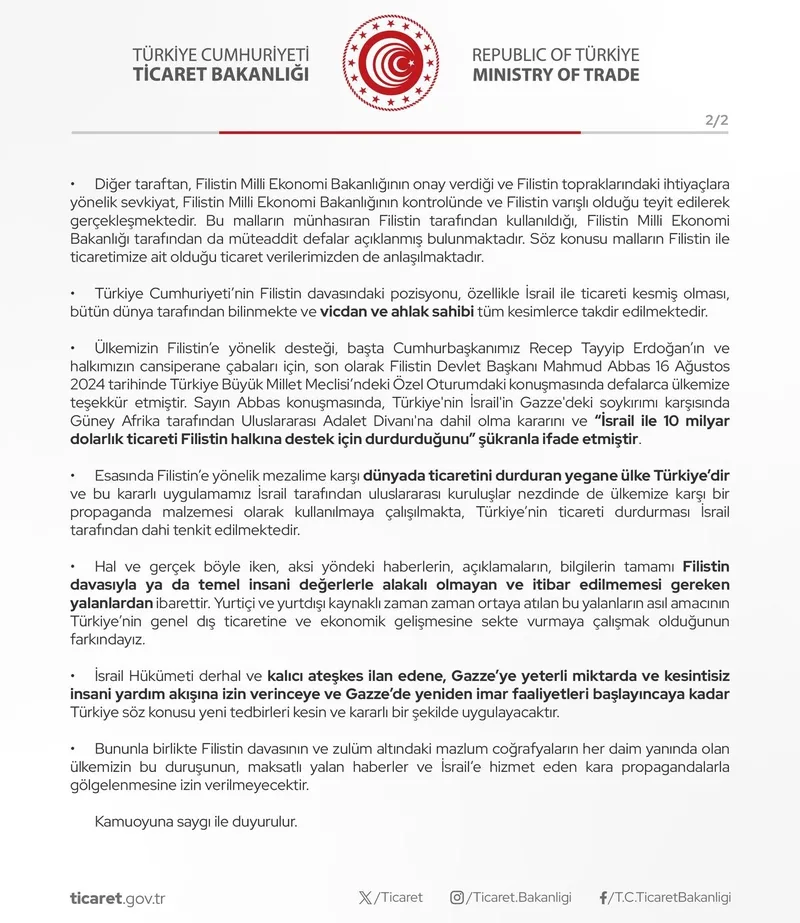 Esasında Filistin'e yönelik mezalime karşı dünyada ticaretini durduran yegane ülke Türkiye'dir ve bu kararlı uygulamamız İsrail tarafından uluslararası kuruluşlar nezdinde de ülkemize karşı bir propaganda malzemesi olarak kullanılmaya çalışılmakta, Türkiye'nin ticareti durdurması İsrail tarafından dahi tenkit edilmektedir. Hal ve gerçek böyle iken, aksi yöndeki haberlerin, açıklamaların, bilgilerin tamamı Filistin davasıyla ya da temel insani değerlerle alakalı olmayan ve itibar edilmemesi gereken yalanlardan ibarettir. Yurtiçi ve yurtdışı kaynaklı zaman zaman ortaya atılan bu yalanların asıl amacının Türkiye'nin genel dış ticaretine ve ekonomik gelişmesine sekte vurmaya çalışmak olduğunun farkındayız.