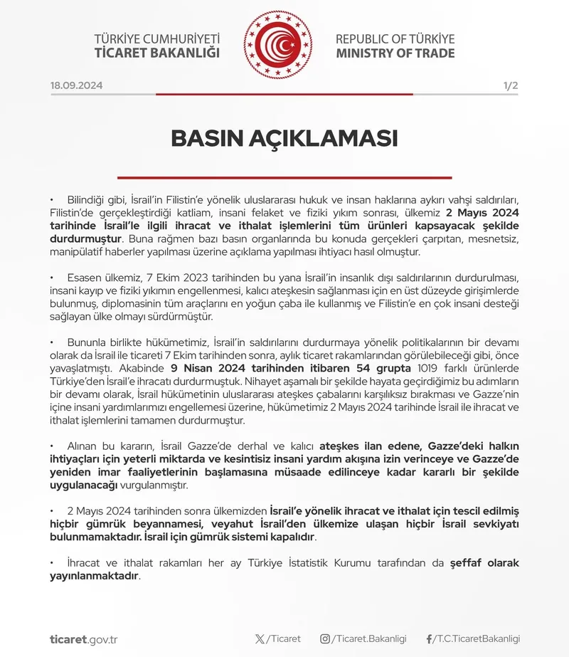 Bakanlığın yazılı açıklamasında, İsrail ile ihracat ve ithalat işlemlerinin tamamen durdurulduğu hatırlatıldı.