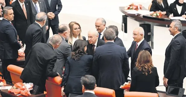 1 Ekim'de TBMM'nin açılışında DEM Partililerle tokalaşmasını değerlendiren MHP lideri Bahçeli, "Genel Başkanı olarak Cumhur İttifakı'nın ve Türk milletinin cumhurbaşkanı görevini üstlenmiş bir şahsın bu çağrısına bir adım atmak, bana düşen en önemli bir görevdir" dedi.