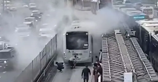 Metrobüsün Sefaköy durağında bir metrobüsün motoru yandı! Ortalık toz duman