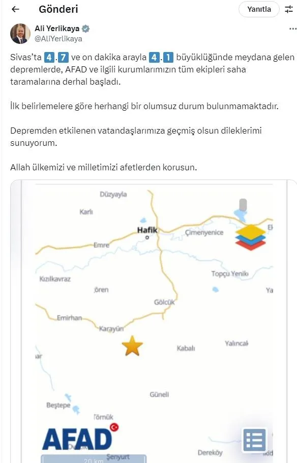 Sivas'ta 4.7 ve on dakika arayla 4.1 büyüklüğünde meydana gelen depremlerde, AFAD ve ilgili kurumlarımızın tüm ekipleri saha taramalarına derhal başladı.