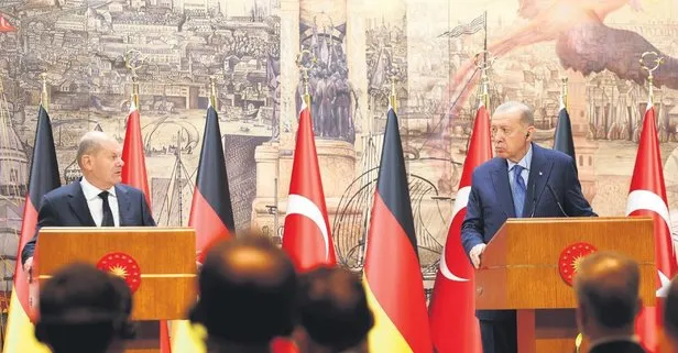 Başkan Erdoğan'ın basın toplantısındaki açıklaması şöyle: Sayın Şansölye ve ekibine bir kere daha hoş geldiniz diyorum. Bu ilişkilerin lokomotifi beşeri bağlarımız ve ortak menfaatlerimizdir. İkili ticaretimiz 50 milyar dolara ulaştı, hedefimiz 60 milyar dolara ulaşmak. Savunma sanayii ürünlerinin tedariki bağlamında geçmişte yaşanan bazı sıkıntıları artık geride bırakarak işbirliğimizi geliştirmeyi arzu ediyoruz. Bu konuda değerli dostum Scholz'un gayretlerini takdirle karşıladığımızı ifade etmek istiyorum.