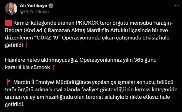 İçişleri Bakanı Ali Yerlikaya, kırmızı kategoride aranan PKK/KCK terör örgütü mensubu Faraşin-Bedran kod adlı Ramazan Aktaş'ın Mardin’in Artuklu ilçesinde bir eve düzenlenen “GÜRZ-19” Operasyonunda çıkan çatışmada etkisiz hale getirildiğini bildirdi.