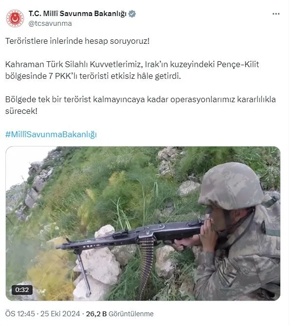 "Kahraman Türk Silahlı Kuvvetlerimiz, Irak'ın kuzeyindeki Pençe-Kilit bölgesinde 7 PKK'lı teröristi etkisiz hâle getirdi. Bölgede tek bir terörist kalmayıncaya kadar operasyonlarımız kararlılıkla sürecek!"