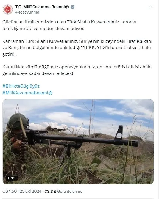"Gücünü asil milletimizden alan Türk Silahlı Kuvvetlerimiz, terörist temizliğine ara vermeden devam ediyor. Kahraman Türk Silahlı Kuvvetlerimiz, Suriye'nin kuzeyindeki Fırat Kalkanı ve Barış Pınarı bölgelerinde belirlediği 11 PKK/YPG'li teröristi etkisiz hâle getirdi. Kararlılıkla sürdürdüğümüz operasyonlarımız, en son terörist etkisiz hâle getirilinceye kadar devam edecek!"