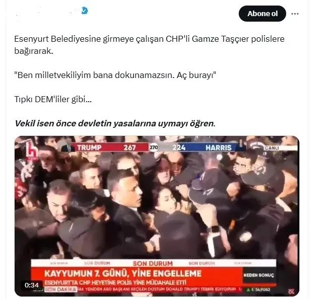 Esenyurt Belediyesine girmeye çalışan CHP'li Gamze Taşçıer polislere bağırarak."Ben milletvekiliyim bana dokunamazsın. Aç burayı" Tıpkı DEM'liler gibi... Vekil isen önce devletin yasalarına uymayı öğren..