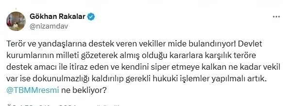 "Terör ve yandaşlarına destek veren vekiller mide bulandırıyor! Devlet kurumlarının milleti gözeterek almış olduğu kararlara karşılık teröre destek amacı ile itiraz eden ve kendini siper etmeye kalkan ne kadar vekil var ise dokunulmazlığı kaldırılıp gerekli hukuki işlemler yapılmalı artık.".
