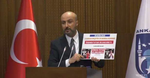 ''Belediye aslı hizmetleri anlamında Ankara Büyükşehir Belediyesi tarihinde en kötü dönemini yaşıyorken, Konser skandallarının arka arkaya geldiğini görüyoruz. Ebru Gündeş konserine 69,Mor ve Ötesi konserine de 71 Milyon Lira ödendiği ortaya çıktı. Ama asıl bomba şu, tüm bu rakamların daha üstünde 29 Ekim 2023 günü yapılan Candan Erçetin ve Murda konseri için Ankara Büyükşehir Belediyesi yönetimi 80 Milyon 40 Bin TL ödeme yapmıştır. Bakın bunun da ödeme belgesi de var. Sözleşmesi de var. Hepsi var. 80 Milyon 40 Bin TL ödeme yapmıştır o günün kuruyla dolara çevirdiğimizde 2 Milyon 838 Bin dolar yapıyor. Bugünkü kurla 97 Milyon 200 Bin TL ödeme yapılmıştır. Bu tarihi bir rakamdır. Hiçbir belediyede tarihte böyle tutar yoktur."