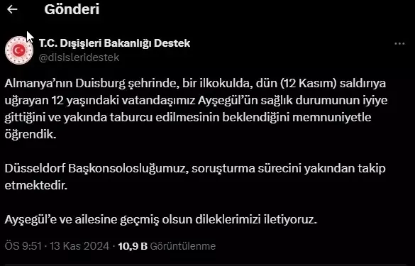 "Almanya'nın Duisburg şehrinde bir ilkokulda dün saldırıya uğrayan 12 yaşındaki vatandaşımız Ayşegül'ün sağlık durumunun iyiye gittiğini ve yakında taburcu edilmesinin beklendiğini memnuniyetle öğrendik. Düsseldorf Başkonsolosluğumuz, soruşturma sürecini yakından takip etmektedir. Ayşegül'e ve ailesine geçmiş olsun dileklerimizi iletiyoruz."