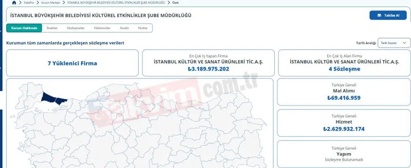 Takvim.com.tr'nin incelediği ihale kayıtlarına göre Ekrem İmamoğlu yönetimindeki İstanbul Büyükşehir Belediyesi 31 Aralık 2019'dan 31 Ekim 2024'e kadar geçen yaklaşık 5 yıllık süre zarfında konser ve çeşitli organizasyonlara Kültür ve Sanat Ürünleri A.Ş üzerinden 5.876.397.012 TL para harcadı.