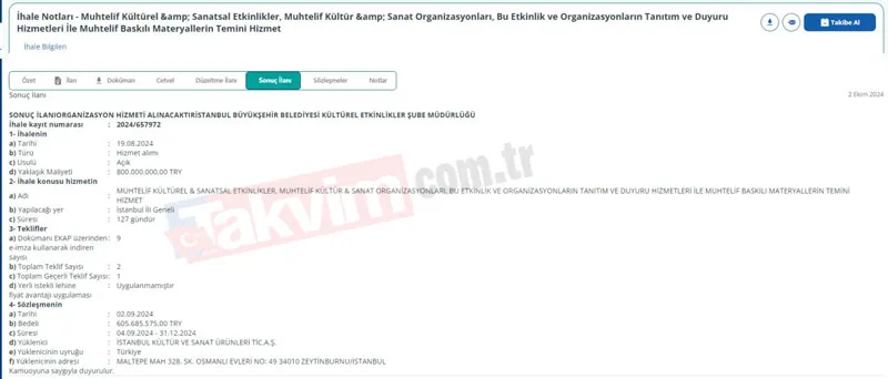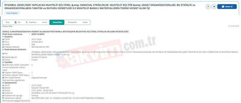 2 Eylül'de Kültürel Etkinlikler Müdürlüğü'nce yapılan ihaleyi Kültür A.Ş. aldı. Bu ihale kapsamında şirkete 605 milyon 685 bin 575 TL ödendi.