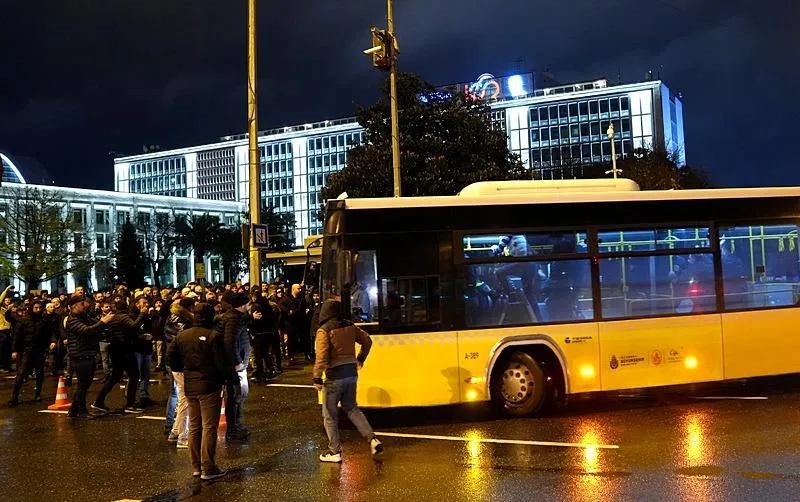 Saraçhane'deki İstanbul Büyükşehir Belediyesi (İBB) binası önünde toplanan İETT'ye bağlı özel halk otobüsü sahipleri, ödemelerini alamadıkları gerekçesiyle eylem gerçekleştirdi. (AA)