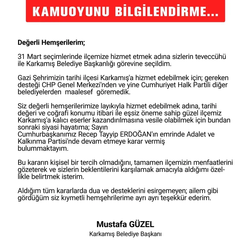 CHP Gaziantep Karkamış Belediye Başkanı Mustafa Güzel, partisinden istifa ederek AK Parti'ye katıldığını açıkladı. Güzel, yaptığı açıklamada, "Siyasi hayatıma; Sayın Cumhurbaşkanımız Recep Tayyip Erdoğan'ın emrinde Adalet ve Kalkınma Partisi'nde devam etmeye karar vermiş bulunmaktayım." ifadelerini kullandı.