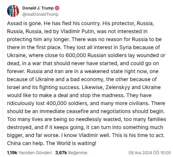 "Esad gitti. Ülkesini terk etti. Koruyucusu, (Rusya Devlet Başkanı) Vladimir Putin'in yönettiği Rusya, artık onu korumakla ilgilenmiyordu." ifadelerini kullanan Trump, Rusya'nın, Suriye'ye ilgisini kaybetmesinin nedeninin Ukrayna olduğunu yazdı.
