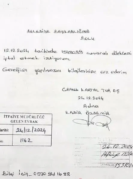25.12.2024'te Bolu Belediyesi otele "Yangına karşı yeterli değil" diye belge vermiyor. Ancak aradan geçen bir hafta sonra 02.01.2025'te "Yangına karşı yeterlidir" belgesi düzenleniyor. Belgenin altında Bolu Belediye Başkanı Tanju Özcan'ın dayı oğlu olan Bolu Belediye Başkan Yardımcısı Sedat Gülener'in imzası bulunuyor.