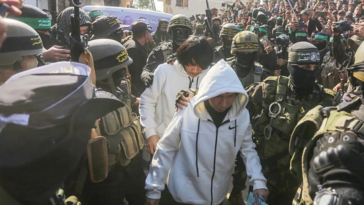 Hamas ile İsrail arasında yapılan esir takası anlaşması kapsamında, Gazze'de tutulan 5 Tayland asıllı esir, Gazze'nin güneyinde yer alan Han Yunus'taki eski Hamas siyasi büro başkanı Yahya Sinvar'ın evin önünden Kızılhaç ekiplerine teslim edildi. (AA)