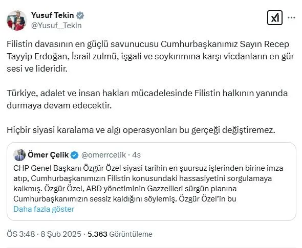 Tekin, "Filistin davasının en güçlü savunucusu Cumhurbaşkanımız Sayın Recep Tayyip Erdoğan, İsrail zulmü, işgali ve soykırımına karşı vicdanların en gür sesi ve lideridir. Türkiye, adalet ve insan hakları mücadelesinde Filistin halkının yanında durmaya devam edecektir. Hiçbir siyasi karalama ve algı operasyonları bu gerçeği değiştiremez." ifadelerini kullandı.
