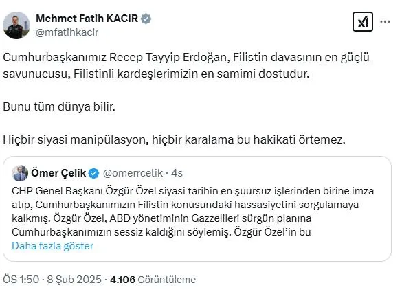 "CHP Genel Başkanı Özgür Özel siyasi tarihin en şuursuz işlerinden birine imza atıp, Cumhurbaşkanımızın Filistin konusundaki hassasiyetini sorgulamaya kalkmış. Özgür Özel, ABD yönetiminin Gazzelileri sürgün planına Cumhurbaşkanımızın sessiz kaldığını söylemiş. Özgür Özel'in bu tutumu tam bir siyasi gaflettir.